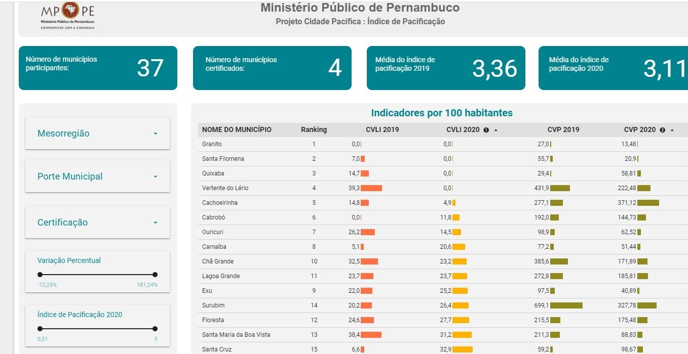 O Ministério Público de Pernambuco (MPPE) divulgou a nova edição do Ranking de Pacificação de cidades do projeto Cidade Pacífica. Segundo os dados compilados até dezembro de 2020, a cidade com o mais alto índice de pacificação no Estado, correspondendo à adoção de medidas concretas para redução da violência em âmbito municipal, é Granito. Ela é seguida de Santa Filomena em segundo lugar; Quixabá em terceiro; Vertente do Lério em quarto; Cachoeirinha, em quinto. O Ranking de Pacificação agora é uma ferramenta também interativa e que pode ser acompanhada pelo cidadão.