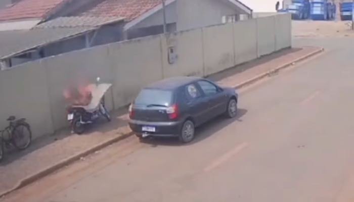 Um vídeo mostra o momento em que uma motocicleta pega fogo. O dono teria deixado um papelão cobrindo a moto para proteger do sol mas infelizmente o pior aconteceu.