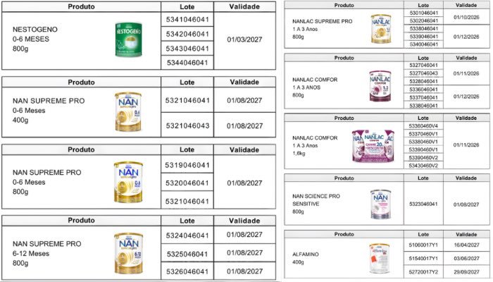 Se você utiliza produtos das marcas Nestogeno, Nan Supreme, Nanlac Supreme, Nanlac Comfor, Nan Sensitive e Alfamino, verifique o número do lote impresso no rótulo das fórmulas infantis. Se o produto pertencer a um dos lotes recolhidos, não deve ser utilizado ou oferecido para consumo. Os demais lotes desses produtos não foram afetados.