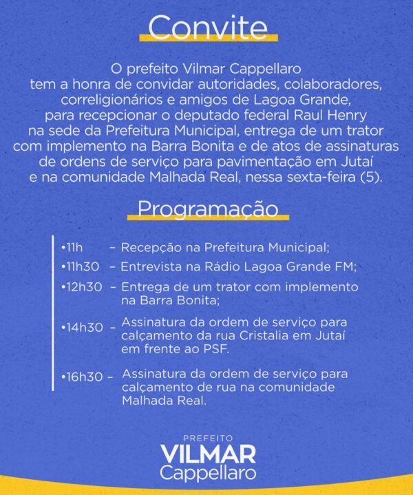 O deputado Raul Henry é o campeão de emendas parlamentares, ações e intervenções que beneficiam a população de Lagoa Grande. Do ano de 2017 até 2021, o montante ultrapassa os R$ 20 milhões. Veja a programação para essa sexta (05) logo abaixo.