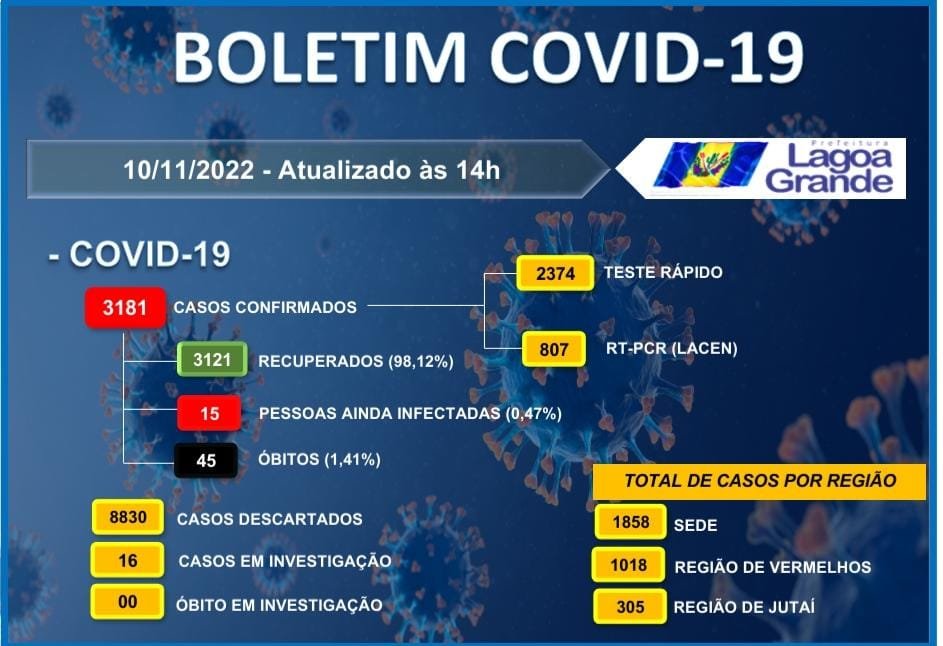 O Boletim Covid-19 da prefeitura de Lagoa Grande divulgado nesta sexta-feira (25), pela Secretaria de Saúde (SESAU), aponta aumento da covid-19 entre os casos positivos. Atualmente são 51 pessoas infectadas.