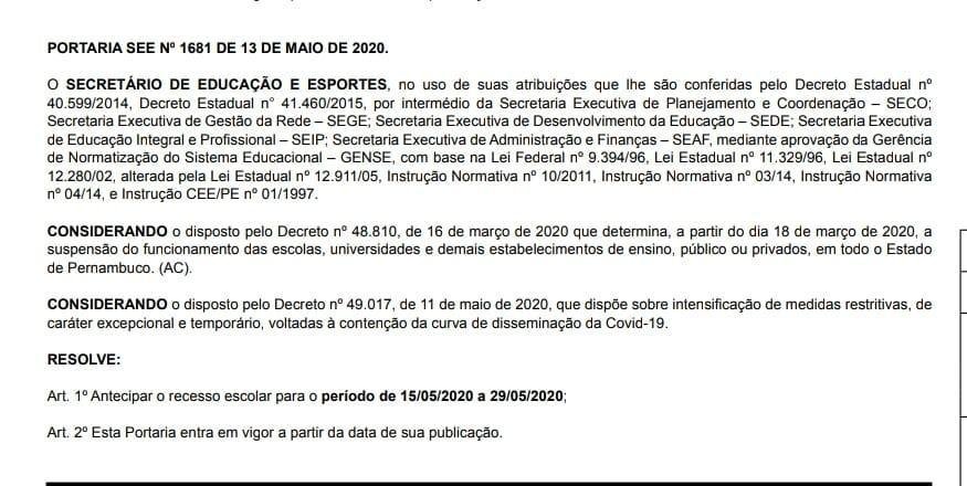 O início do recesso escolar do mês de julho para as escolas estaduais em Pernambuco foi antecipado para esta sexta-feira (15). De acordo com a Secretaria de Estado de Educação, o motivo é ampliar as ações de prevenção da transmissão do novo coronavírus. Segundo a portaria de Nº 1681, o recesso que seria entre os dias 09 e 24 de julho, foi antecipado para o período de 15/05 até o dia 29/05.