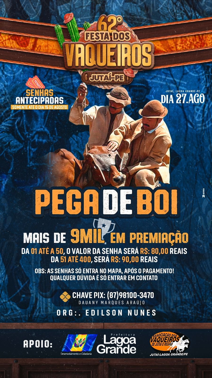 Além da escolha da Rainha dos Vaqueiros, a 62º edição da Festa do Vaqueiro terá mais de R$ 9 mil em premiação. As inscrições para escolher a rainha da festa já estão abertas e seguem até o dia 15 de agosto. Para fazer a inscrição, entre em contato através do número: (87) 98127-7576, falar com Idelvania. Continue lendo após a publicidade