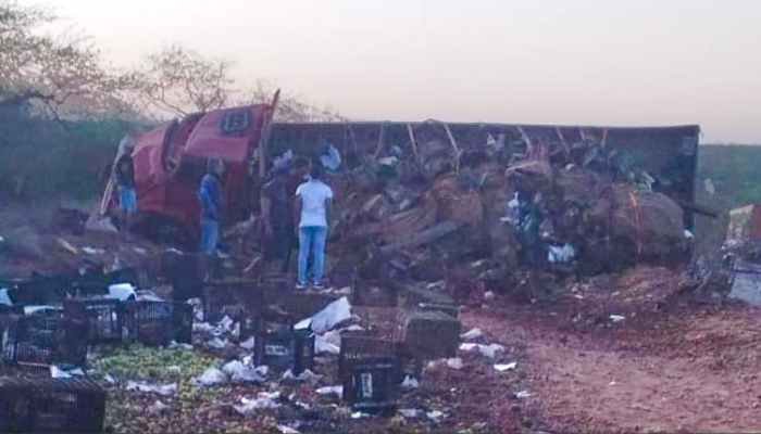 Um acidente automobilístico na tarde desta sexta-feira (25) deixou o motorista de um caminhão carregado de frutas ferido.