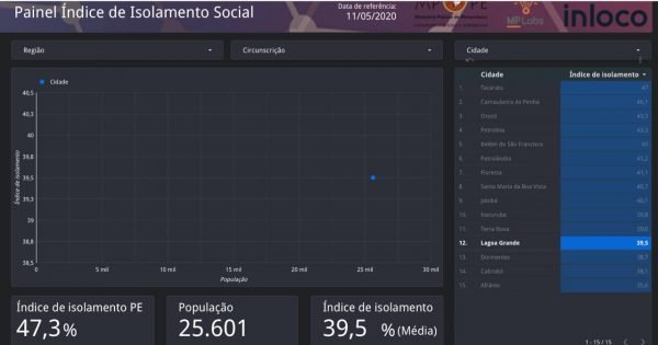 O isolamento social continua sendo a principal forma de conter o avanço do novo coronavírus (Covid-19), por conta dessa necessidade o Ministério Público de Pernambuco, desenvolveu uma ferramenta que possa mensurar a adesão popular no isolamento social. A ferramenta é pública e está disponível para ser acessada no site do MPPE, no endereço:https://datastudio.google.com/u/0/reporting/1CaZl5DfH_Ohj1wmb7mArBDpdZkna1r9q/page/LSrOB?s=p3vHxnrBoWE