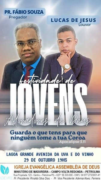 A Igreja Assembleia de Deus Ministério de Madureira, da cidade de Lagoa Grande, localizada na Av. da Uva e do Vinho, em frente a Concha Acústica, realiza de hoje (26) até o sábado (29), uma grande festividade em adoração a Deus.