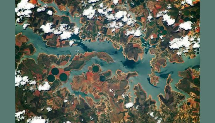 Um astronauta a bordo da Estação Espacial Internacional da Nasa tirou esta foto enquanto orbitava o sudeste do Brasil. A imagem foca no Reservatório de Três Marias, um corpo d’água artificial alimentado pelo Rio São Francisco.