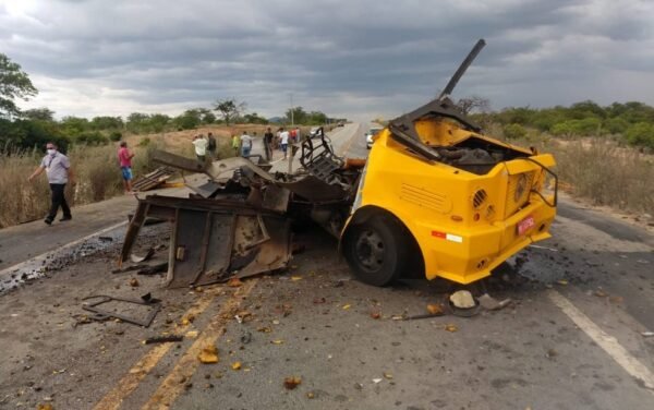 Um carro-forte foi explodido por bandidos na manhã desta terça-feira (9), na BR-235, trecho da cidade de Juazeiro, norte da Bahia. Quatro funcionários estavam no veículo no momento do crime e tiveram ferimentos leves, segundo informações iniciais da Polícia Militar. Após a ação criminosa, o veículo ficou completamente destruído.