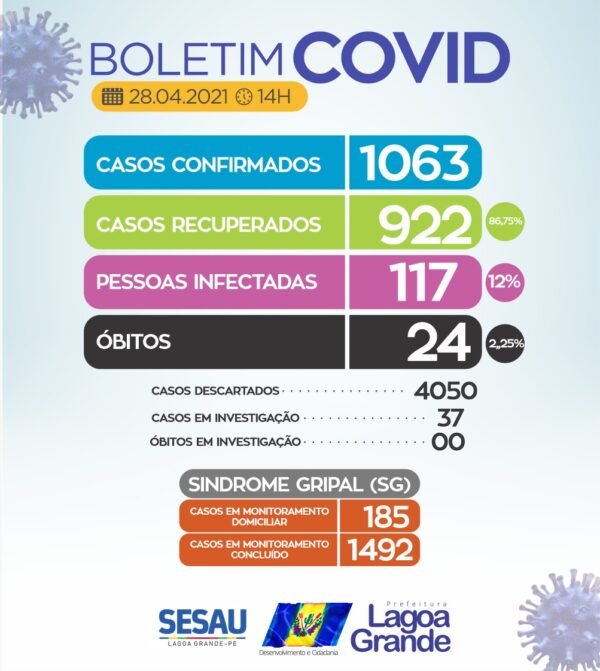 A Secretaria de Saúde de Lagoa Grande informa que nesta quarta-feira (28), o município registrou 17 novos casos da Covid-19. Atualmente, 117 pessoas estão em recuperação domiciliar. Destacamos que no mesmo período, nenhum óbito foi registrado. Como o boletim de ontem (27), registrou 128 casos, o munícipio teve uma redução de 11 casos em 24h.