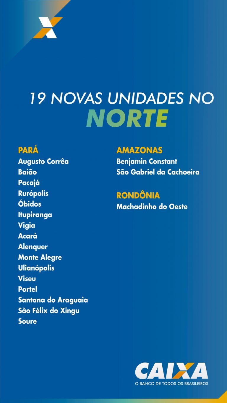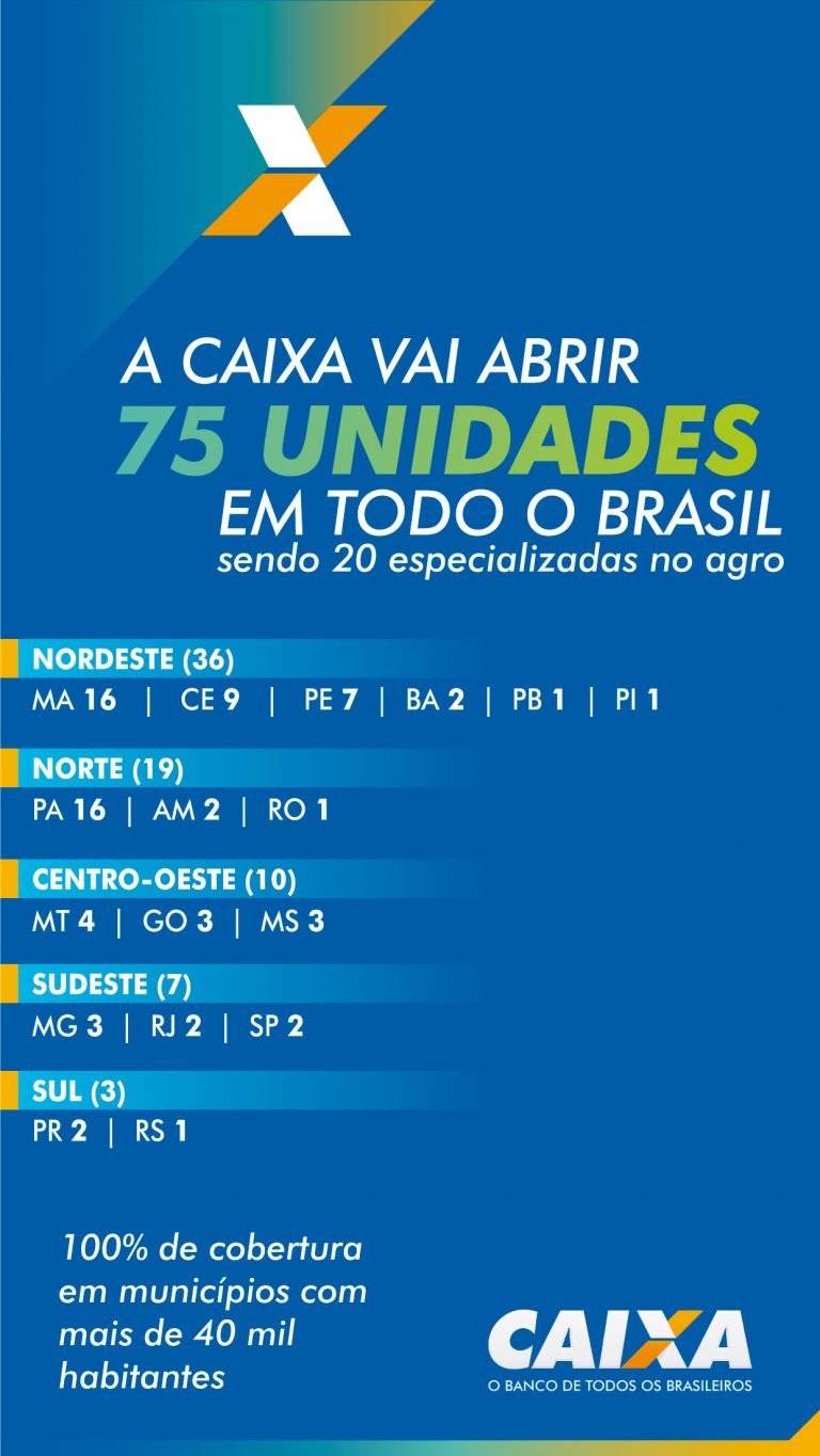 O presidente da CAIXA, Pedro Guimarães, anunciou nesta quinta-feira (28/01) a criação de 75 novas unidades em todo o Brasil, sendo 20 unidades especializadas no agronegócio. A expansão visa aumentar a capilaridade do banco, com foco nas regiões Norte e Nordeste. Com a ampliação de sua rede de atendimento, a CAIXA beneficiará cerca de 18 milhões de brasileiros.