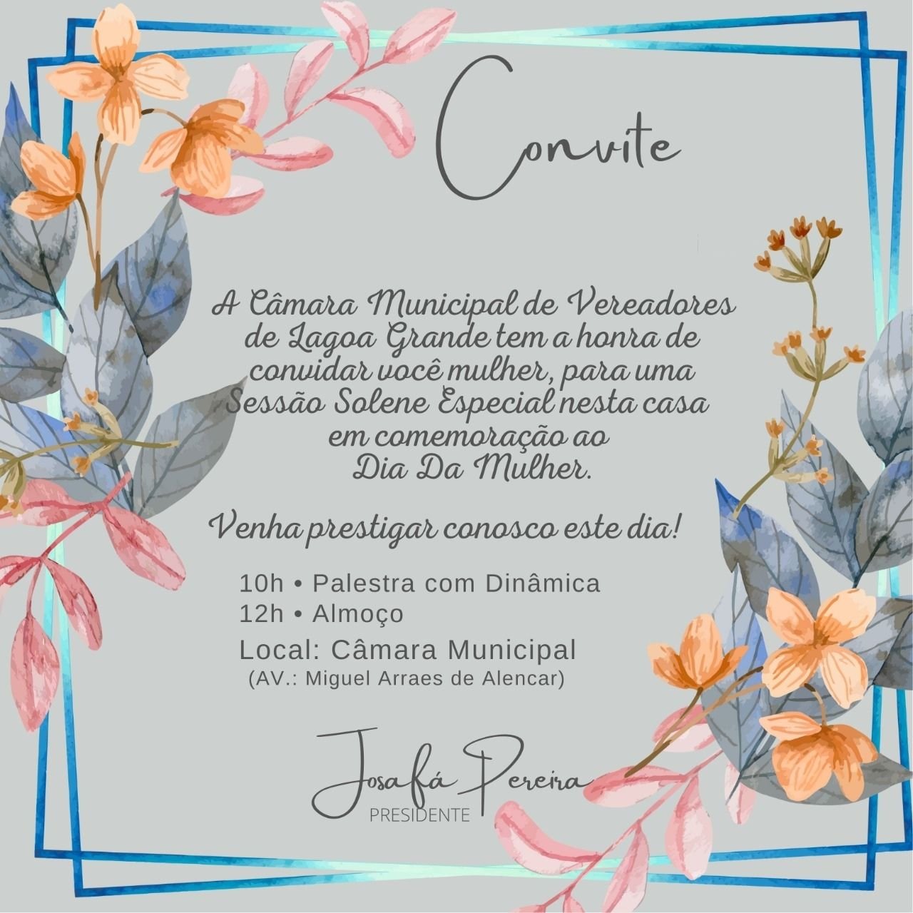 Para comemorar o Dia Internacional da Mulher, a Câmara Municipal de Lagoa Grande realiza, hoje, 08 de março de 2022, às 10h, uma Sessão Solene Especial em homenagem ao Dia Internacional da Mulher. A programação especial contará com palestra, dinâmica e um almoço.