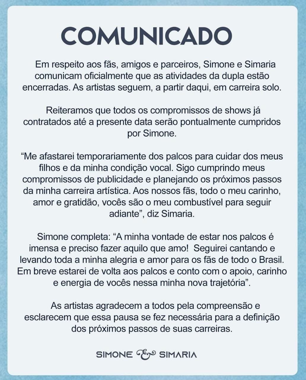 “Em respeito aos fãs, amigos e parceiros, Simone e Simaria comunicam oficialmente que as atividades da dupla estão encerradas. As artistas seguem, a partir daqui, em carreira solo.