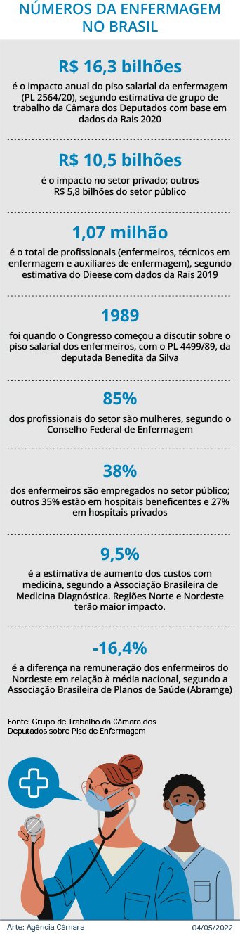 A Câmara dos Deputados aprovou nesta quarta-feira (13), em dois turnos de votação, a Proposta de Emenda à Constituição (PEC) do Piso da Enfermagem (PEC 11/22), a qual determina que lei federal instituirá pisos salariais nacionais para o enfermeiro, o técnico de enfermagem, o auxiliar de enfermagem e a parteira. Agora a proposta irá à promulgação.
