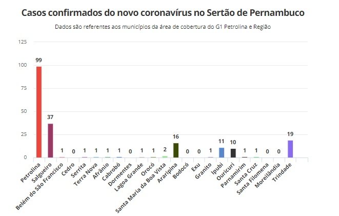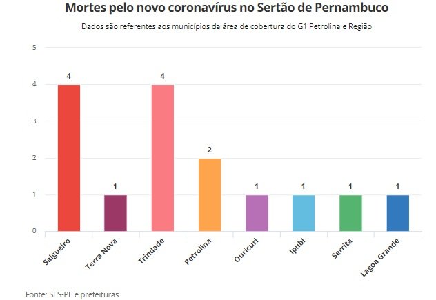 Na área de cobertura do portal G1 Petrolina e Região, são 14 óbitos. Lagoa Grande registrou a primeira morte na quinta-feira (14). Além desse novo óbito, tiveram quatro mortes em Salgueiro, uma em Terra Nova, quatro em Trindade, dois em Petrolina, uma em Ouricuri, uma em Ipubi e uma em Serrita.