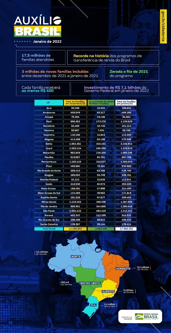O Governo Federal inicia em 18 de janeiro de 2022 o pagamento do Auxílio Brasil, com um patamar inédito de mais de 17,56 milhões de famílias. O quantitativo é o maior da história dos programas de transferência de renda do país e “zera a fila” de 3,06 milhões de pessoas com solicitação e elegíveis a entrarem no programa em dezembro de 2021. O investimento total para os pagamentos supera os R$ 7,1 bilhões e o repasse mínimo por família será de R$ 400. O Sudeste teve um crescimento de 28,45% no número de beneficiários atendidos. Passou de 3,94 milhões para 5,07 milhões de cidadãos.