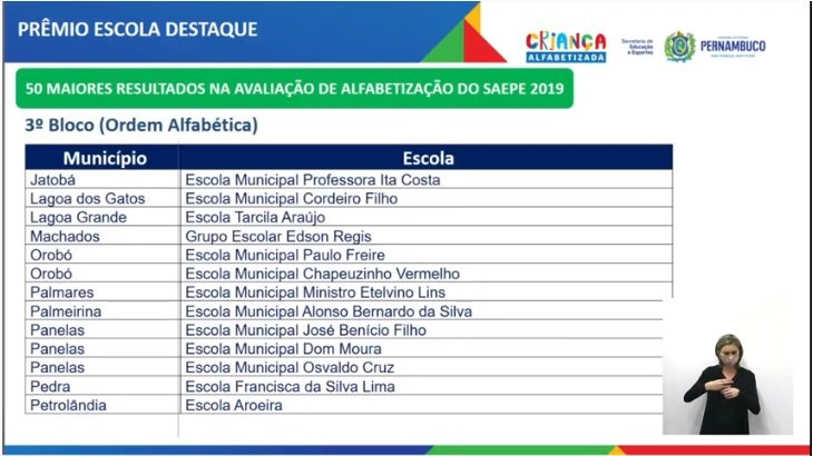 Na premiação, foram conhecidas as 50 escolas municipais que apresentaram os melhores desempenhos e foram agraciadas com o Prêmio Escola Destaque. Todas receberão R$ 80 mil de incentivo para continuar o bom trabalho. A Escola Municipal Tarcila de Araújo na cidade de Lagoa Grande foi destaque nessa premiação pelo bom desempenho.