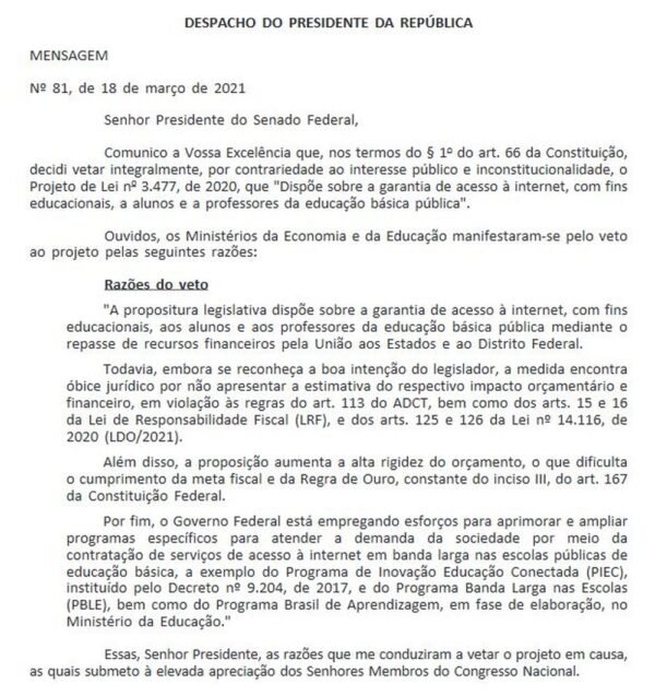 O presidente Jair Bolsonaro vetou integralmente o projeto que buscava assegurar internet grátis a alunos e professores da educação na rede básica. O veto total foi publicado na edição desta sexta-feira (19) do “Diário Oficial da União” (DOU). O Senado aprovou a matéria em fevereiro. A proposta já havia sido aprovada pela Câmara em dezembro de 2020.
