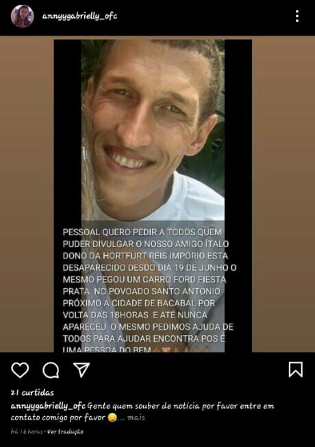 Ítalo foi deixado por um motociclista até a entrada da BR-316, entrou em um carro no qual tinha desembargado duas mulheres e não deu mais notícias. Quem tiver qualquer informações sobre o empresário, pode entrar em contato para os números (99) 9 8110-3914 ou (87) 9 8826-9385 (esposa de Ítalo).