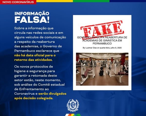 Fake news: Governo de Pernambuco nega abertura de academias de ginásticas na próxima semana