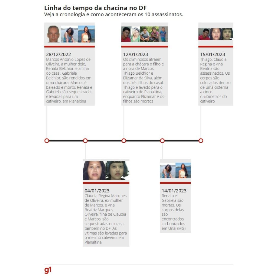 Os assassinatos de 10 pessoas de uma família do Distrito Federal movimentaram a Polícia Civil em dois estados, além do DF, para solucionar a motivação e a autoria dos crimes. Tudo começou com o desaparecimento da cabeleireira Elizamar da Silva e dos três filhos dela, em 12 de janeiro. Desde então, cinco pessoas foram presas, e todas as vítimas foram localizadas.