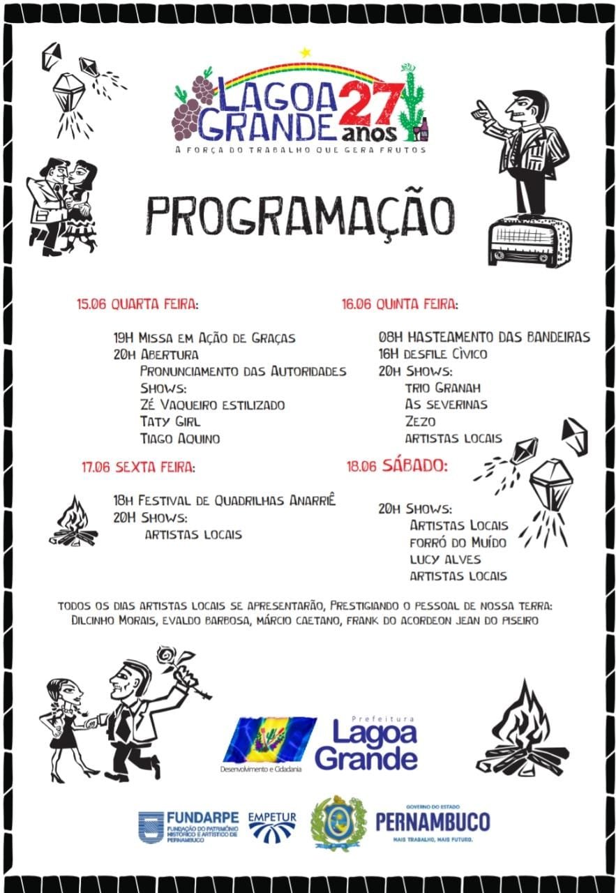 A magia do São João da Terra da Uva e do Vinho irá contar com o festival de quadrilhas juninas. Os festejos de aniversário de Lagoa Grande também terá Missa em Ações de Graça (15/06), hasteamento das bandeiras (16/06) e o desfile cívico (16/06).