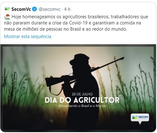 A Secretaria de Comunicação Social da Presidência da República publicou uma foto de um homem armado em sua conta no Twitter, na manhã desta quarta-feira (28), para fazer uma homenagem ao Dia do Agricultor.