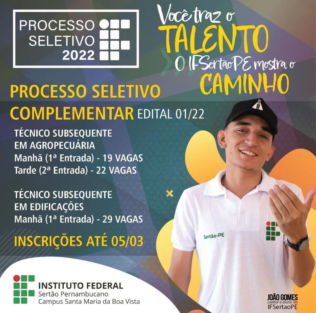 O Campus Santa Maria da Boa Vista do Instituto Federal de Educação, Ciência e Tecnologia do Sertão Pernambucano (IFSertãoPE) abre hoje inscrições para o Processo Seletivo Complementar para ocupação de 70 vagas remanescentes do processo seletivo para os cursos do ensino técnico Subsequente, do Edital nº 33/2021, para ingresso nos 1º e 2º semestre de 2022.