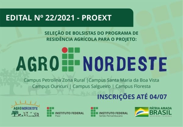 O IFSertãoPE publicou, nesta segunda-feira (21), o edital nº 22/2021, referente à seleção de bolsistas para o Programa Residência Profissional Agrícola (PRPA) do projeto AgroIFNordeste. São cinco vagas para cada uma das cinco unidades onde as atividades do projeto serão desenvolvidas: campi Petrolina Zona Rural, Santa Maria da Boa Vista, Ouricuri, Salgueiro e Floresta. As inscrições podem ser feitas até as 23h59 do dia 4 de julho, exclusivamente através do preenchimento do formulário eletrônico disponível aqui.