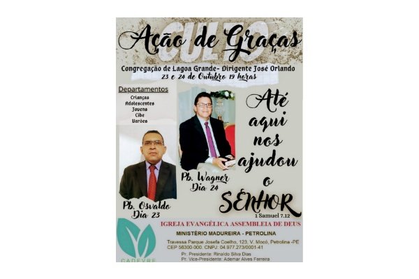 A Igreja Assembléia de Deus Ministério Madureira, de Lagoa Grande, convida a população lagoa-grandense para adorar a Deus, no grande Culto de Ações de Graças nos dias 23 e 24 de outubro, o tema será baseado em 1º Samuel 7.12: “Até aqui nos ajudou o Senhor”.