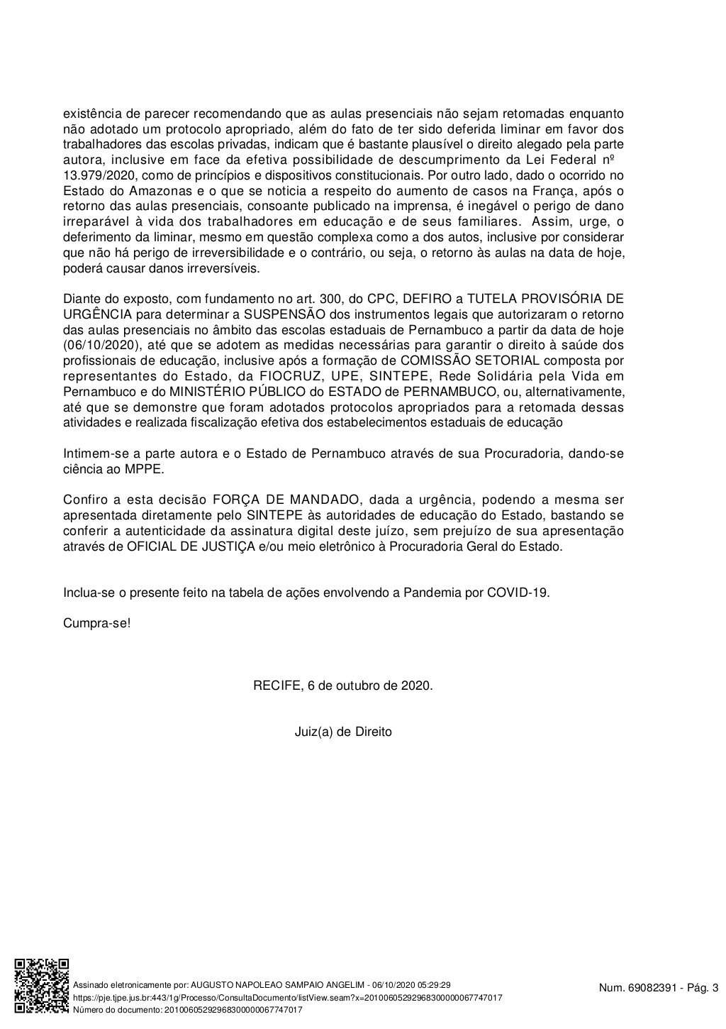 Na segunda (5), o TJPE havia ordenado que o sindicato não começasse a paralisação, considerando que a motivação do movimento “não se apresenta legítima”, já que não havia risco adicional à categoria e que o protocolo sanitário de retorno às aulas presenciais tem base científica.