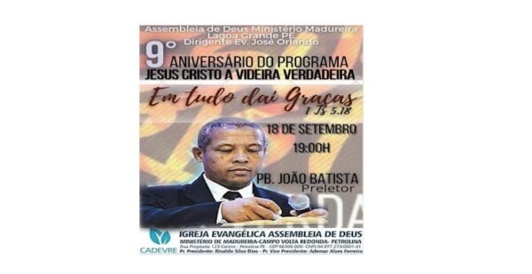 Com o tema baseado em 1 Tessalonicenses 5.18: “Em tudo dai graças”, a Igreja Assembleia de Deus Ministério Madureira, em Lagoa Grande, realizará no sábado (18), às 19h, um Culto de Ações de Graças comemorando o 9⁰ Aniversário do Programa Jesus Cristo a Videira Verdadeira. O Programa é transmitido ao vivo de segunda à sexta-feira na Rádio Lagoa Grande FM 88.7.