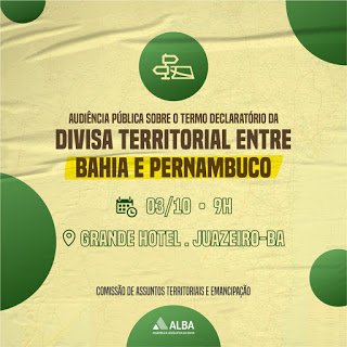 No próximo dia 3 de outubro (quinta-feira), às 9 horas, no Grande Hotel, em Juazeiro, a Comissão de Assuntos Territoriais e Emancipação da Assembleia Legislativa da Bahia (ALBA) promove audiência pública com objetivo de debater o termo declaratório da divisa territorial entre Bahia e Pernambuco.
