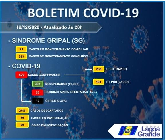 A Secretaria de Saúde de Lagoa Grande (PE), Sertão do São Francisco, registrou em seu boletim epidemiológico de hoje (19), 35 pessoas infectadas com a Covid-19, 15 a mais em relação ao último boletim. O município está com 427 casos confirmados, 382 curados e dez óbitos até o momento.