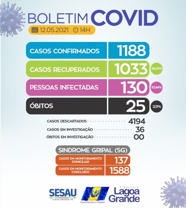A Secretaria de Saúde de Lagoa Grande informa que nesta quarta-feira (12), o município registrou 30 novos casos da Covid-19. Atualmente, 130 pessoas estão em recuperação domiciliar. Destacamos que no mesmo período, nenhum óbito foi registrado.