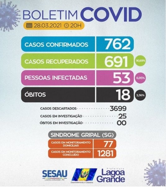 A Secretaria de Saúde de Lagoa Grande informa que neste domingo (28), o município registrou dois novos caso da Covid-19. Atualmente, 53 pessoas estão infectadas e em recuperação domiciliar. Destacamos que no mesmo período, nenhum óbito foi registrado.