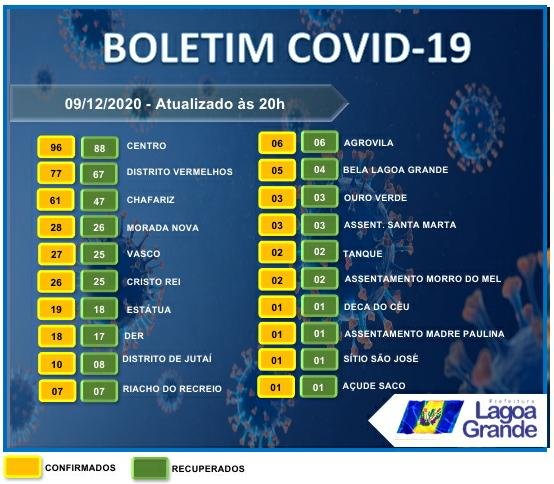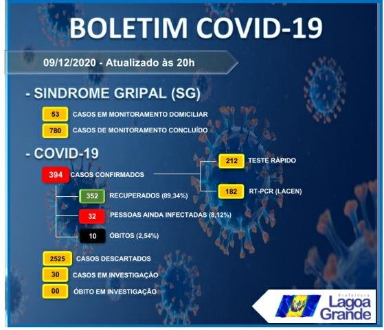 A Secretaria de Saúde de Lagoa Grande (PE), Sertão do São Francisco, registrou em seu boletim epidemiológico de hoje (09). Em 24 horas, houve uma alta de 3 novos casos ativos da doença. O município está com 394 casos confirmados, 352 curados, 32 casos ativos e dez óbitos até o momento.