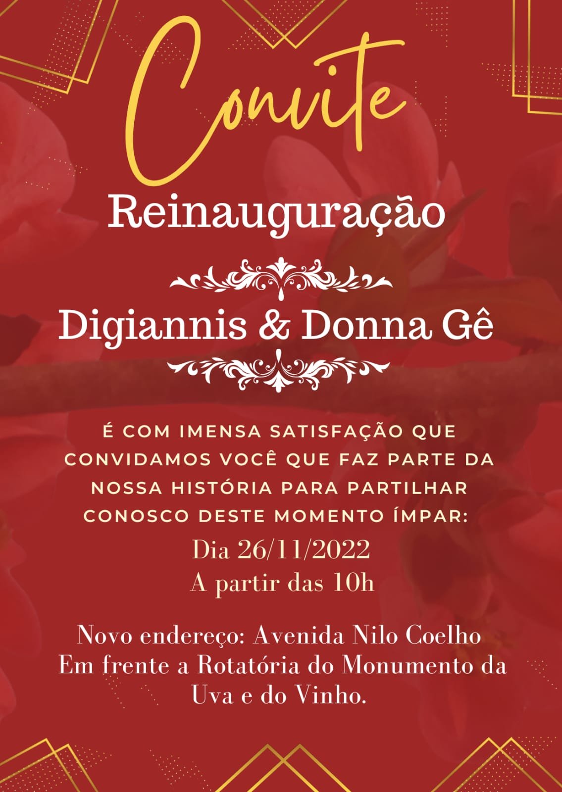 Em amplo espaço e com novas e modernas instalações, serão reinauguradas no próximo sábado (26), as lojas Digiannis e Donna Gê. Os estabelecimentos agora irão funcionar na Avenida Nilo Coelho, em frente a Rotatória do Monumento da Uva e do Vinho.