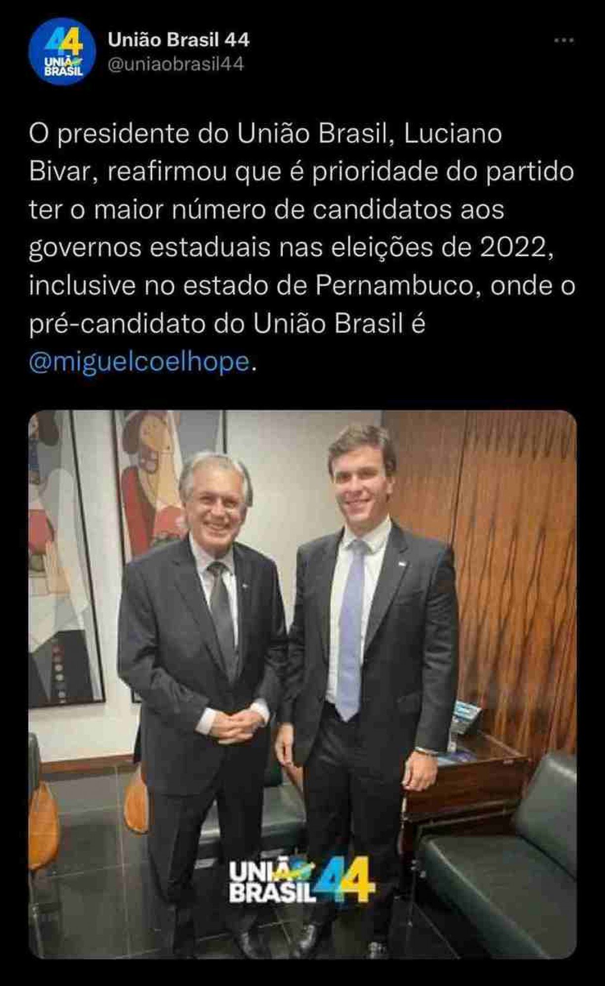 Ainda mais porque, em seguida, o próprio perfil do União Brasil no Instagram fez uma publicação, com uma outra foto de Miguel e Bivar, juntos, e um texto que reafirmava a pré-candidatura. A publicação foi essa: