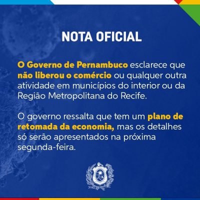 Enquanto o prefeito de Petrolina Miguel Coelho anunciou um plano de abertura gradual do comércio que vai durar aproximadamente 60 dias, o governador de Pernambuco postou uma nota esclarecendo que não liberou a abertura do comércio ou qualquer outra atividade em municípios do interior ou da região Metropolitana do Recife. O governo fechou nota dizendo que na segunda-feira (01) será apresentado um plano detalhado da retomada da economia.