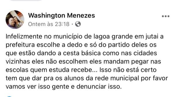 O internauta Washington Meneses, morador de Jutaí, distrito de Lagoa Grande, publicou na sua página no Facebook uma grave denúncia envolvendo o município de Lagoa Grande e a distribuição de cestas. Veja abaixo na íntegra a publicação de Washington Meneses.