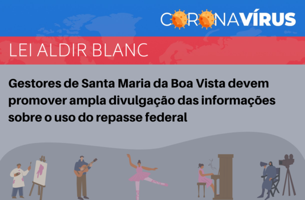 Para o devido controle social e transparência, o Ministério Público de Pernambuco (MPPE), por meio da Promotoria de Justiça local, recomendou ao prefeito do município de Santa Maria da Boa Vista, Humberto Mendes, e à secretária-executiva de Cultura, Jeifa Jericó, que promovam a ampla divulgação das informações sobre ao valor do repasse federal, por força da Lei Aldir Blanc, bem como sobre quais critérios utilizados para cadastramento das entidades ou pessoas físicas habilitadas ao pagamento, bem como a quantia que caberá a cada um.