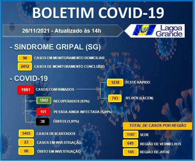 Até hoje, dia 26, por exemplo, foram confirmados mais 148 casos de Covid-19. Assim, Lagoa Grande termina a semana com 1.981 casos confirmados, 1.842 curas e 101 pessoas infectadas, no dia primeiro eram apenas 19 pessoas. Não sabemos quais as causas para elevar o número consideravelmente, mas uma coisa é certa, a população não pode relaxar com os protocolos sanitários, mesmo com o avanço da vacinação. Em relação aos óbitos, Lagoa Grande vive um momento positivo, visto que são quase cinco meses sem nenhum registro. Veja abaixo o boletim de hoje, dia 26.
