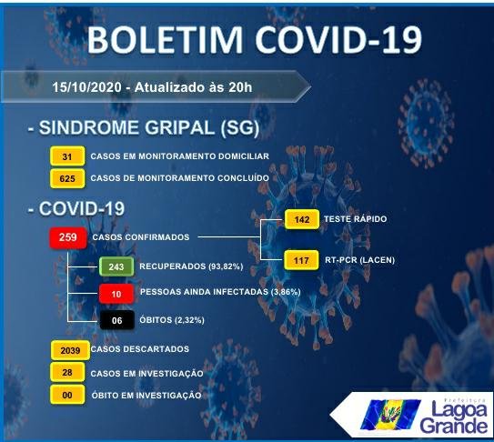 De acordo com o boletim, enviado ao Blog do Everaldo, Lagoa Grande contabiliza 259 casos confirmados da Covid-19; destes, 243 já estão clinicamente curados. Seis mortes foram registradas desde o início da pandemia, em março.