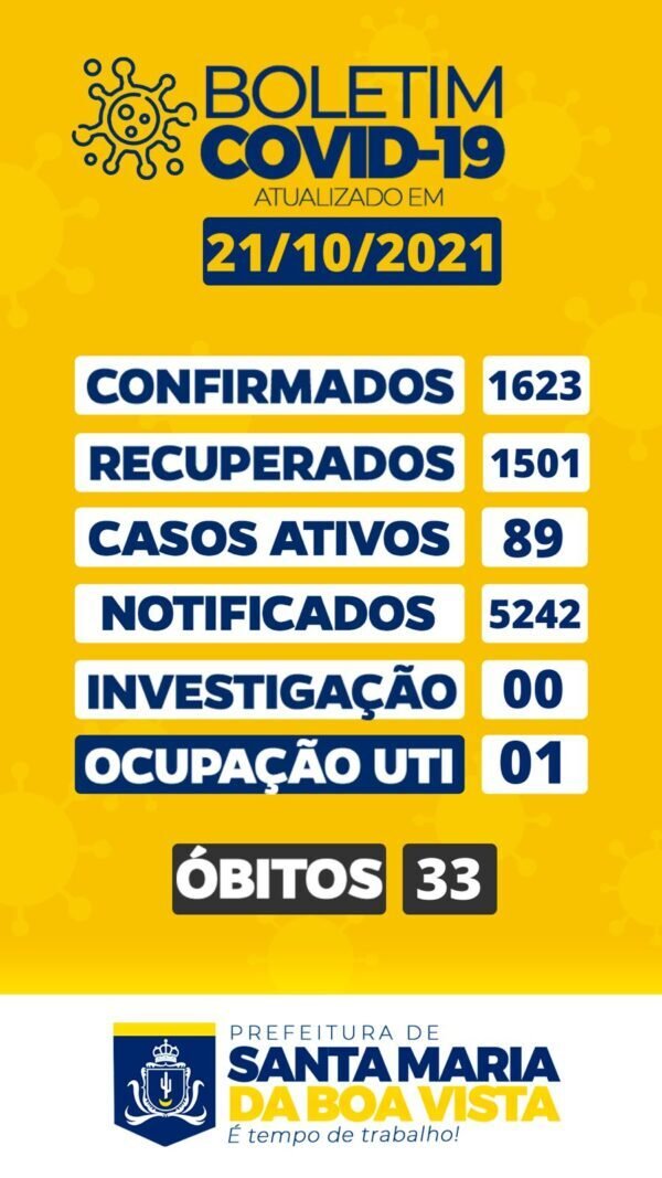 Os números da Covid-19 em Santa Maria da Boa Vista voltou a assustar a população. O boletim divulgado pela gestão municipal na noite desta quinta (21) registrou um aumento no número de óbitos. Só no mês de outubro, duas mortes foram registradas. Segundo a prefeitura, o primeiro ocorreu no dia 04 e o segundo no dia de hoje (21). Com essas duas mortes, o município chega a um total de 33 óbitos desde o início da pandemia.