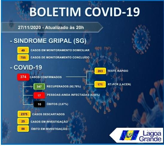 Nesta sexta-feira (27), o boletim Covid-19 em Lagoa Grande registra que 374 pessoas foram confirmadas com a doença. Destas, 347 já foram diagnosticadas com a cura clínica e outras 17 pessoas continuam infectadas pelo Novo Coronavírus. Já o número de óbitos subiu para dez pessoas. Veja as informações abaixo e os bairros com os casos confirmados e as curas.