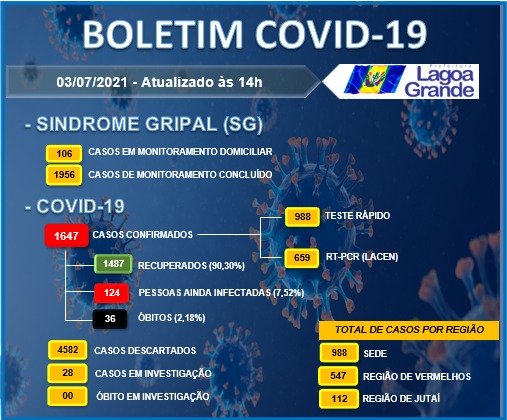 A Secretaria de Saúde de Lagoa Grande informa que nesta sábado (03), o município registrou 03 novos casos da Covid-19. Atualmente, 124 pessoas estão em recuperação domiciliar. Destacamos que no mesmo período, um óbito foi registrado.