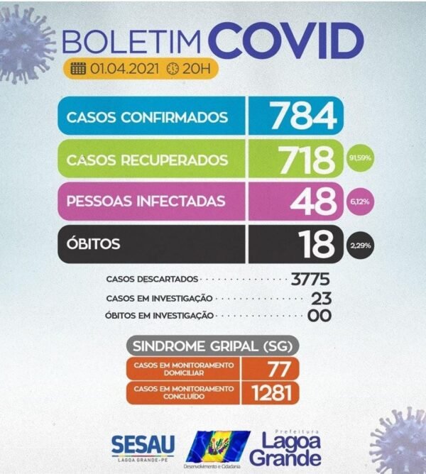 A Secretaria de Saúde de Lagoa Grande informa que nesta quinta-feira (1°), o município registrou seis novos casos da Covid-19. Atualmente, 48 pessoas estão em recuperação domiciliar. Destacamos que no mesmo período, nenhum óbito foi registrado.