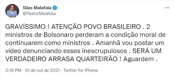 Malafaia chamou as autoridades de “inescrupulosas” e prometeu que a divulgação será um “verdadeiro arrasa quarteirão”. “Gravíssimo! Atenção, povo brasileiro. Dois ministros de Bolsonaro perderam a condição moral de continuarem como ministros. Amanhã vou postar um vídeo denunciando esses inescrupulosos. Será um verdadeiro arrasa quarteirão”, escreveu em seu Twitter (veja abaixo)