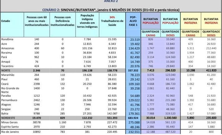 Veja abaixo a quantidade que será distribuída a cada estado – considerando as 6 milhões de doses fornecidas pelo Instituo Butantan.
