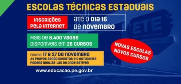 Estão abertas as inscrições para o preenchimento de 8.445 vagas em Cursos Técnicos, ofertados na forma Médio-Integrado à Educação Profissional, em jornada integral, pelas Escolas Técnicas Estaduais (ETEs). As inscrições devem ser realizadas pelo site www.educacao.pe.gov.br até 16 de novembro. Caso o candidato não tenha acesso à internet, as ETEs disponibilizarão um local de apoio com computador para efetivação da inscrição.